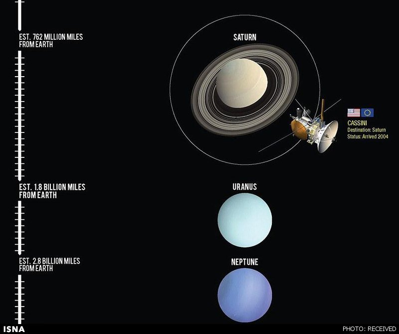 زحل: فضاپیمای کاسینی ناسا و آژانس فضایی اروپا (ESA) سال 2004 به مدار این سیاره رسید و هماکنون در فاصله 1 میلیارد و 219 کیلومتری زمین قرار دارد.