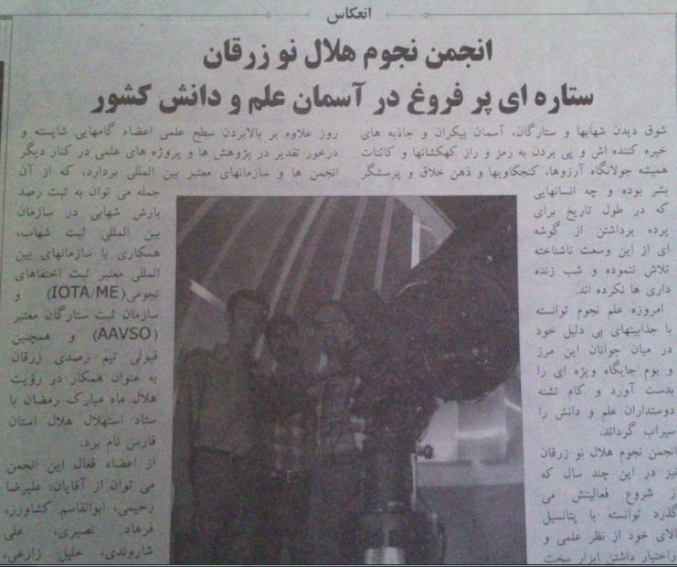 بالاخره گوشه ای از فعالیتهای قابل تحسین انجمن نجوم هلال نو زرقان از طریق نشریه شهرمان با تیتر زیبای "انجمن نجوم هلال نو زرقان ستاره ای پرفروغ در آسمان علم و دانش کشور" به گوش همشهریان عزیز رسید.